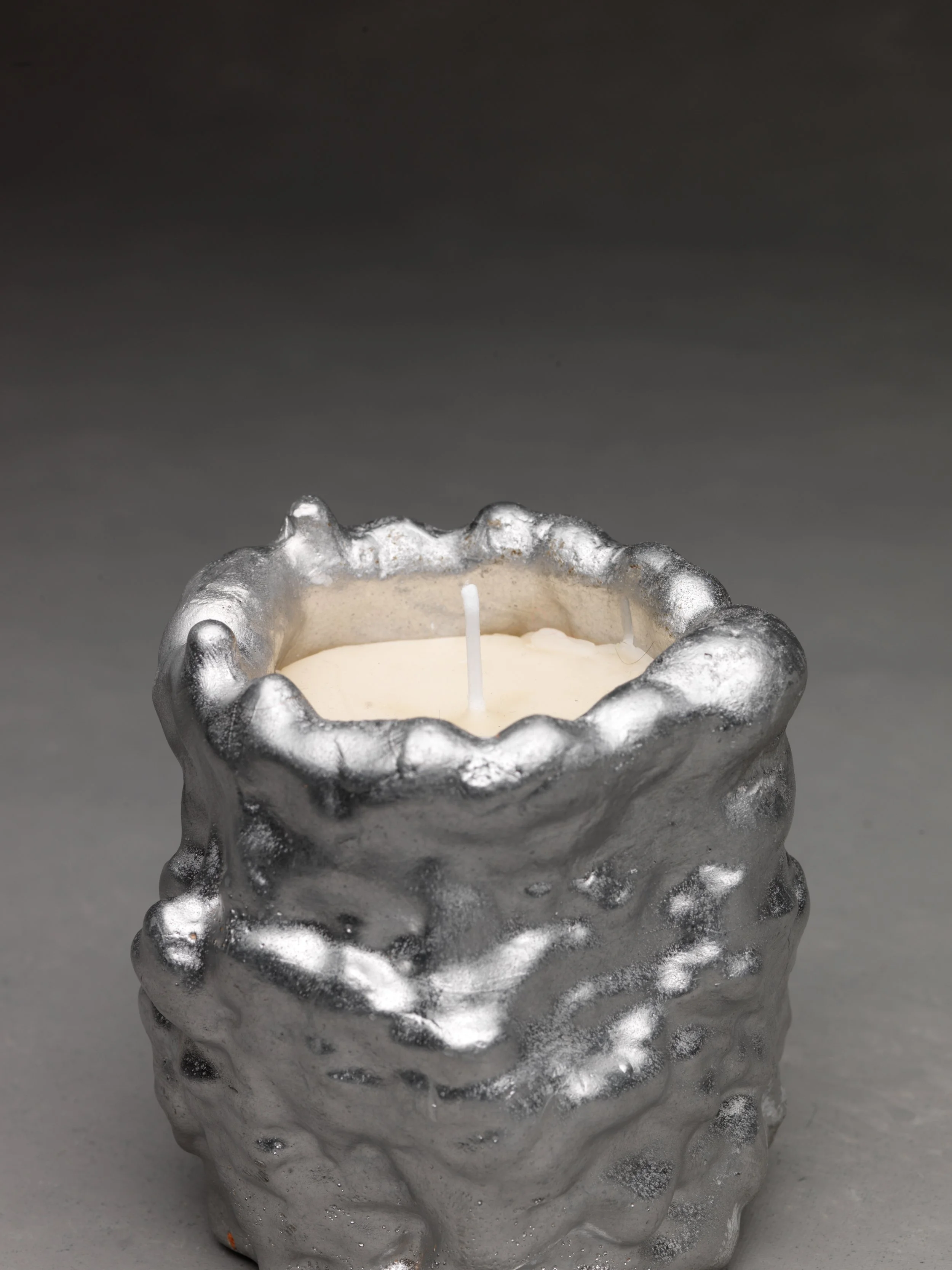 The candles in aluminium vessels hold a loop-closing, poetic connection between the different yet kindred materials and processes in this object; the melting and cooling, the recycled and recyclable. Durable forever, hard, cold, hot, soft and volatile.
